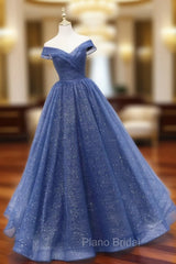 A-Line Off Shoulder Dark Blue Long Formal Prom Dresses, Shiny Tulle Long Graduation Dresses