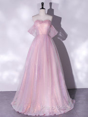 A-Line Sweetheart Neck Tulle Sequin Pink Long Formal Prom Dresses, Pink Tulle Formal Dresses