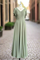 A-line V-neck Ruffle Sleeves Pleats Chiffon Bridesmaid Dress with Ruffles