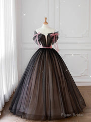 Black off shoulder tulle long prom dress, black tulle formal dress
