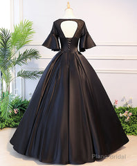 Black Round Neck Satin Lace Long Prom Dress, Sweet 16 Dress