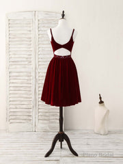 Burgundy V Neck Velvet Short Prom Dress, Burgundy Homecoming Dress