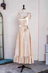 Champagne Sleeveless Ruffled A-line Tea-Length Bridesmaid Dresses with Sash