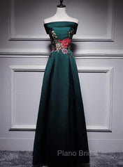 Dark Green Satin Off Shoulder Floor Length Satin Party Dresses, Green Formal Prom Dresses Formal Dresses