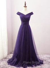 Dark Purple Sweetheart Tulle Off Shoulder Bridesmaid Dresses, Long Formal Prom Dresses