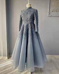 modest blue Formal Prom Dresses lace emroidery evening Dresses