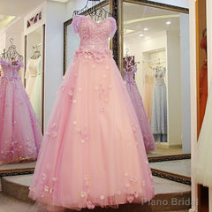 Pink Off Shoulder Lace Applique Tulle Flowers Prom Dress, Pink Formal Dress Sweet 16 Dress