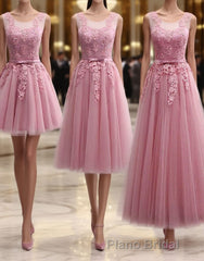 Pink Round Neck Lace Tulle Formal Prom Dresses, Lace Evening Dresses