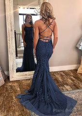 Sheath/Column Square Neckline Sleeveless Court Train Lace Prom Dresses With Appliqued