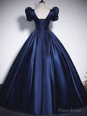 Short Sleeves Dark Blue Long Prom Dresses, Dark Blue Short Sleeves Long Formal Evening Dresses