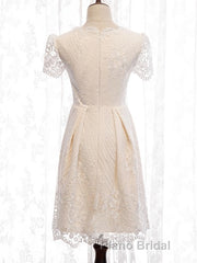 Short Sleeves Short Champagne Lace Formal Prom Dresses, Short Champagne Lace Formal Wedding Dresses