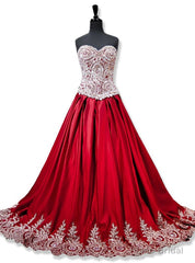 Sweetheart Gold Lace Appliques Ball Gowns Red Prom Dress