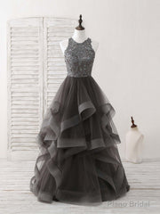 Unique Round Neck Lace Applique Tulle Long Prom Dresses