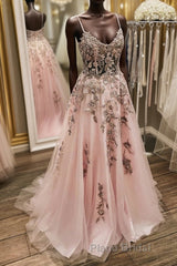 V Neck Backless Pink Lace Long Formal Prom Dress, Long Pink Lace Formal Evening Dress