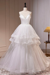 White V-Neck Tulle Long Prom Dress, A-Line Evening Dress with Train